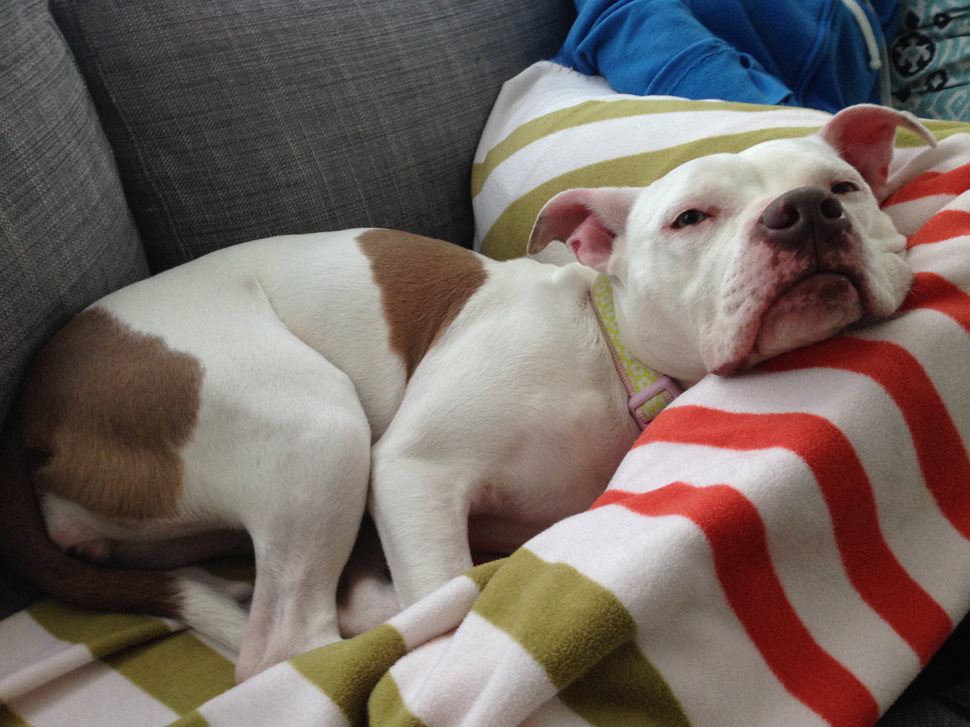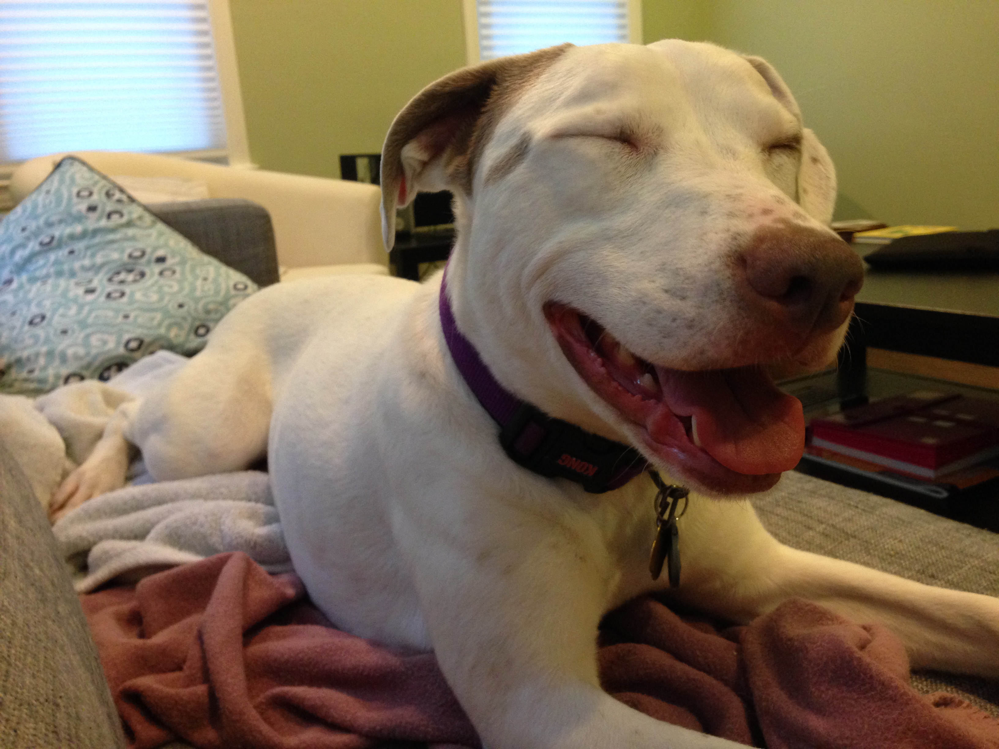 Caitlin and I have two dogs. The younger one is named Jersey and is sweet, affectionate, and great with people and animals alike. This is Jersey: