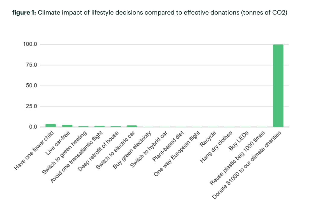 It’s still important for me—and everyone else—to try and manage their carbon emissions but, my oh my, does that chart put into perspective how important financial support is in the fight against climate change. Personal actions matter, sure, but broad, systemic change is driven by policy and, because capitalism has kind of broken democracy, it takes a lot of money to change policy. But every little bit counts: As the chart above shows, if you donate as little as $100 to the right place, you can do as much good for the environment as if you got rid of your car, bought your neighbor an electric car to replace their gas-powered one, and then decided not to have that kid you had been planning to have. Or you could, you know, donate $100.